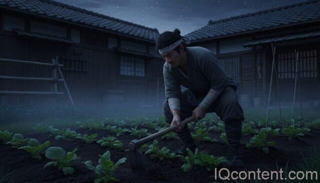 04:00 起床: まだ星が瞬く頃、足軽の一日は始まります。完全な兵農分離が進んだ後でも、多くの足軽は長屋裏の家庭菜園や共有の畑を世話し、貴重な自給自足分を確保します。
